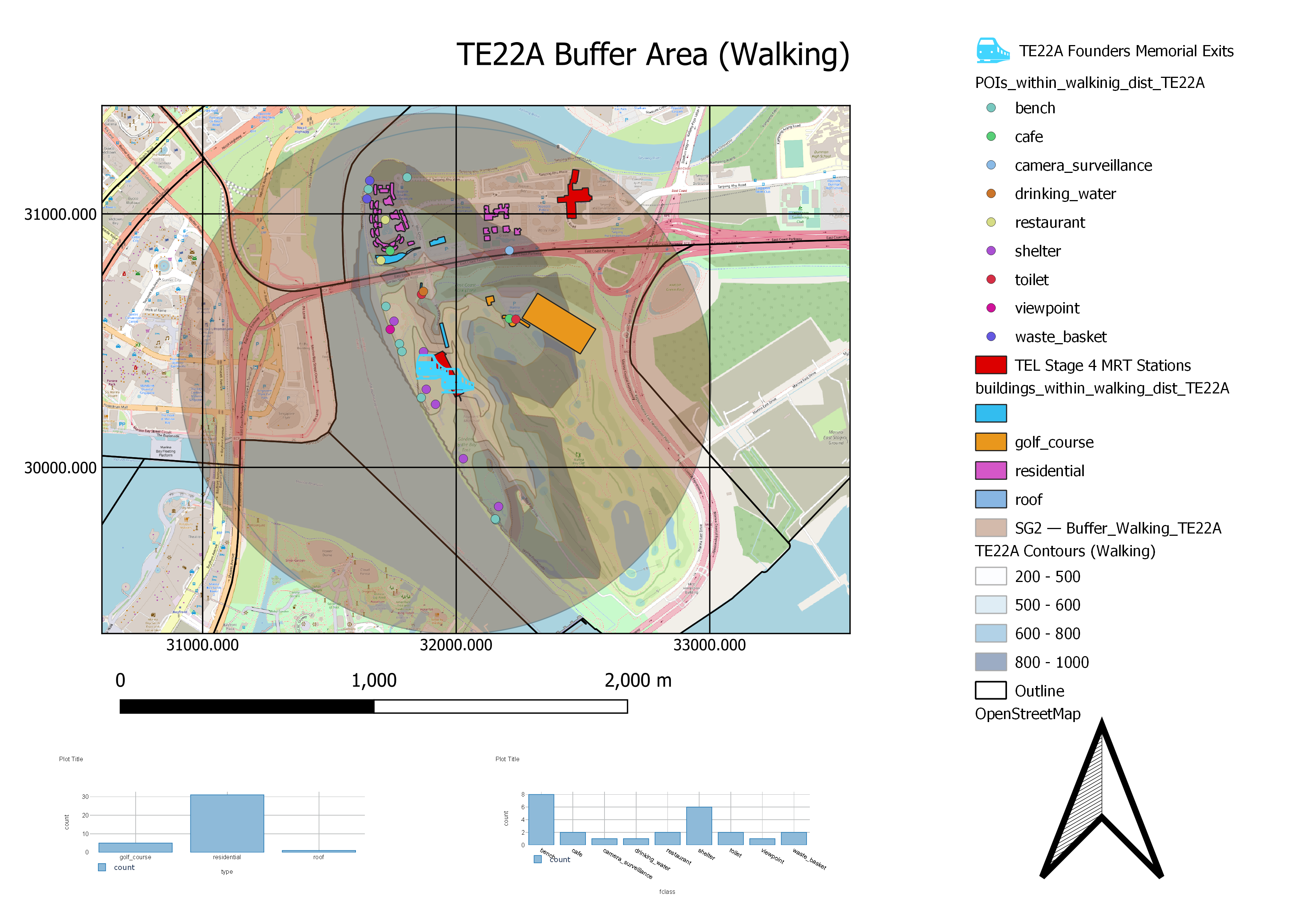 Notably, there are few residential areas within the walking catchment area. The residential areas are also within the 800-1000m contour, where only a small number of people would be willing to walk. However, this MRT station is near several tourist attractions such as Founder's Memorial, Garden by the Bay East and Marina Bay Golf Course. In doing so, people who wish to visit these areas will have their needs better accommodated to and businesses that cater to them may see increased foot traffic. Hence, tourists and tourist-facing businesses are the main beneficiaries of this station. This would mean that TE22A will not be very useful for first mile journeys, but will be catered more for last mile journeys for people to get to these tourist spots and recreational activities.