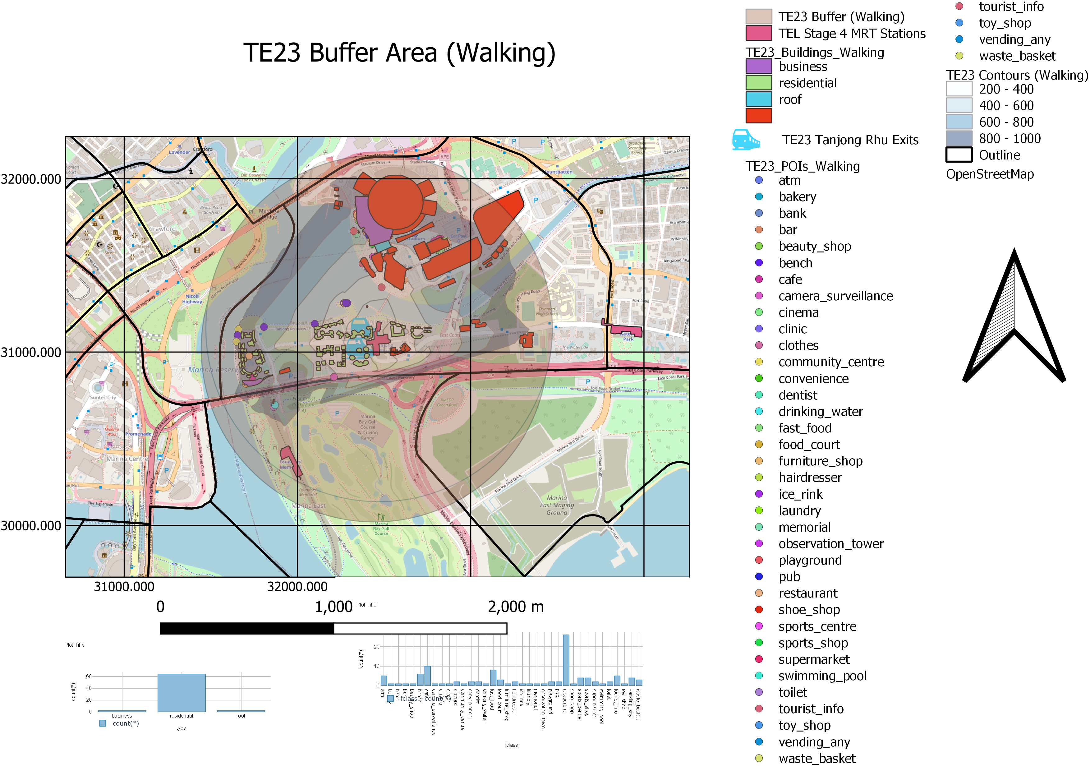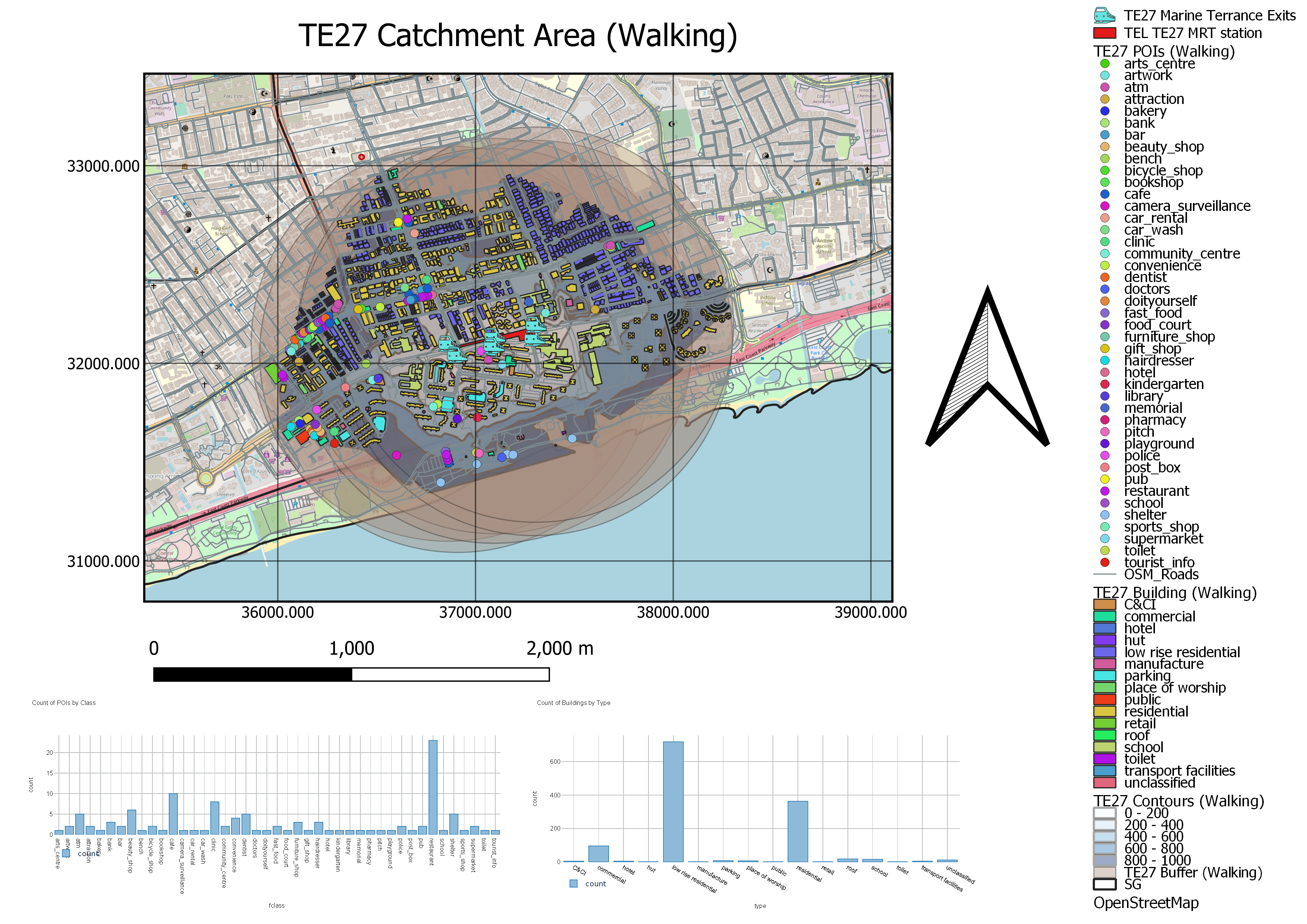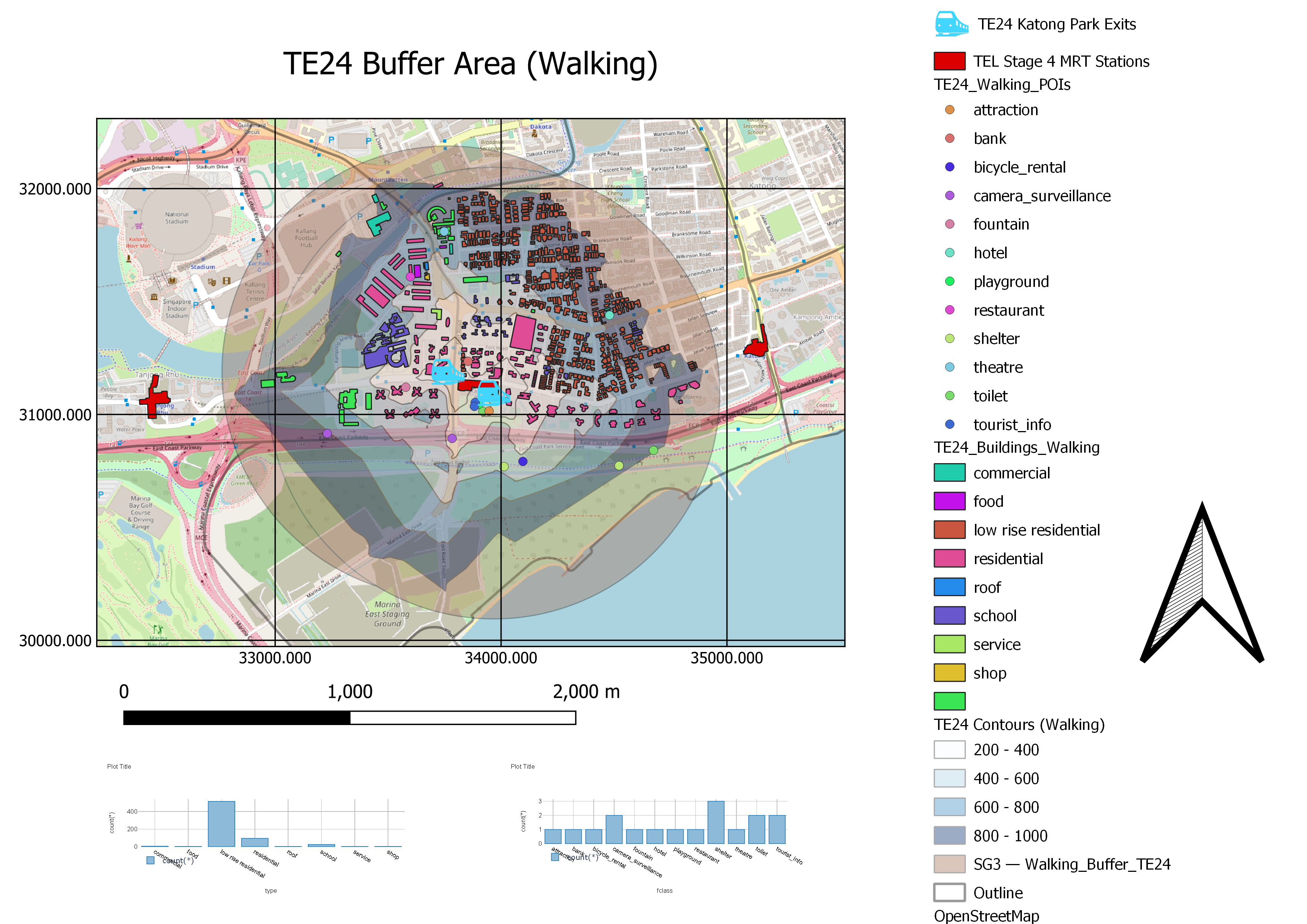 The walking catchment area covers a significant number of residential buildings - both high rise and low rise, including hotels and condominiums. This could suggest that the TEL would need to be able to accommodate a diverse pool of needs, ranging from tourists and residents. Importantly, the majority of them are low rise residential areas, where people are generally car owners. Hence, by making public transport more accessible to these residents, the ease of first mile journey using public transport will highly encourage them to use their cars less frequently and opt to use the train when travelling instead.