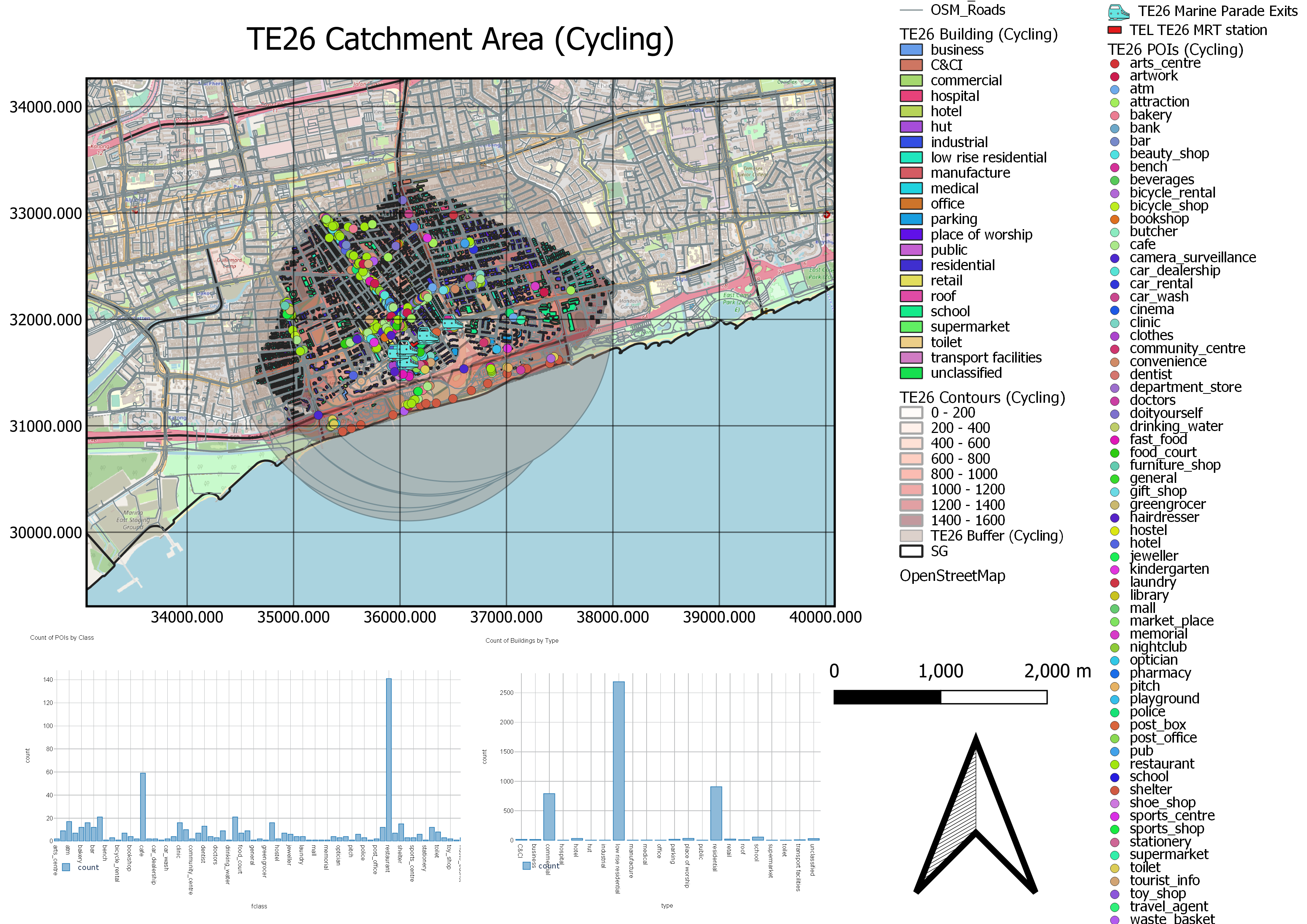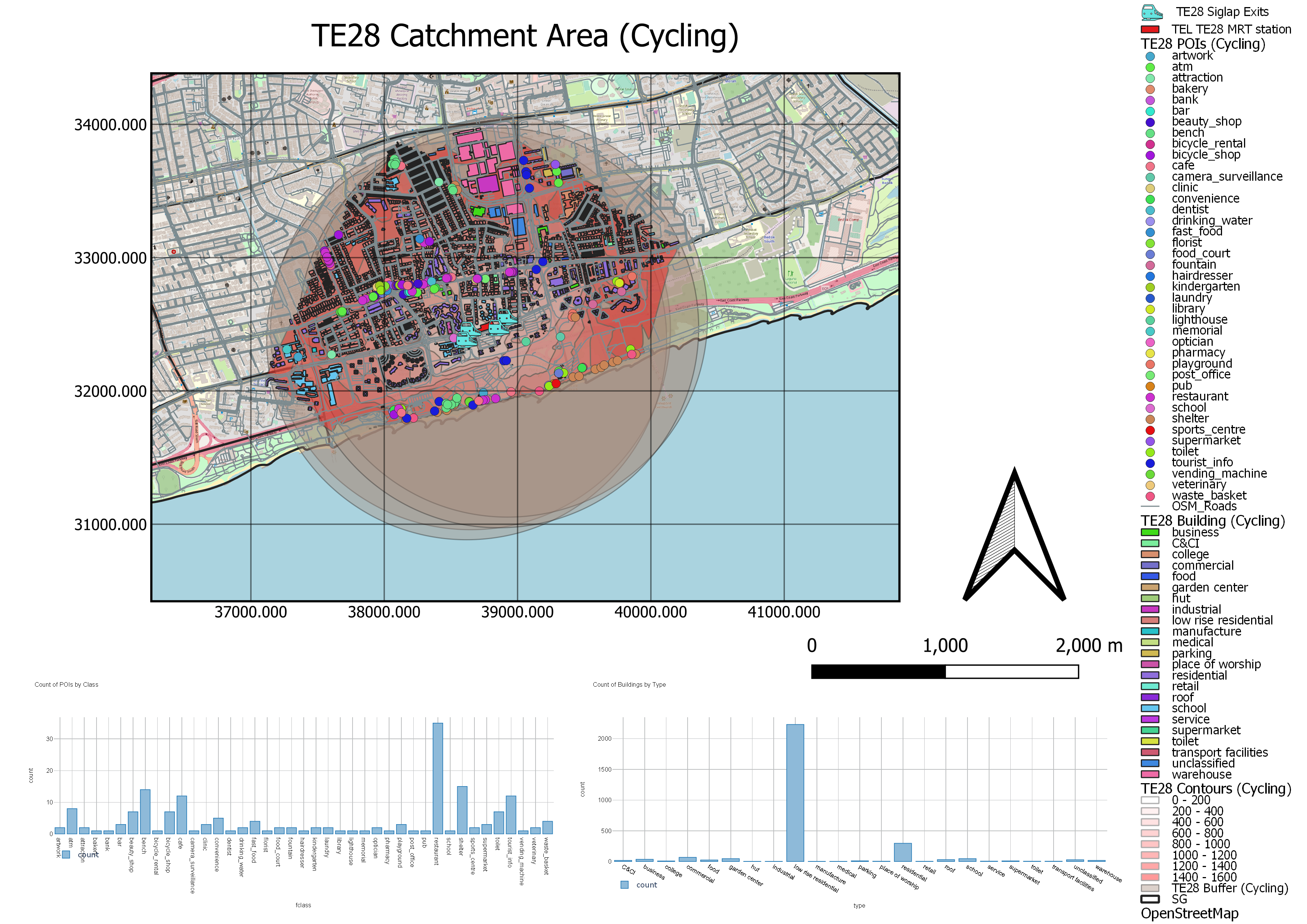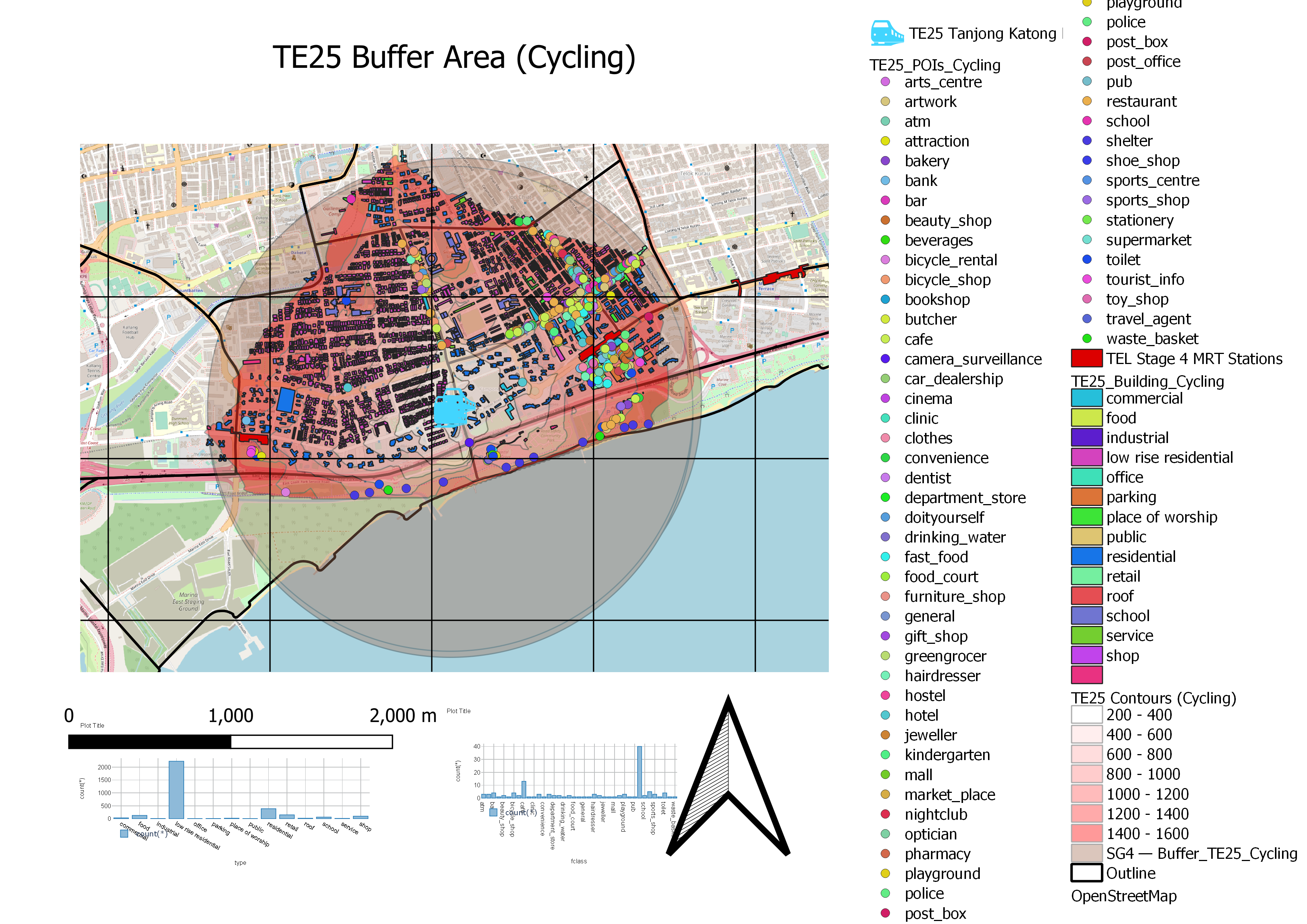 For the cycling catchment area, even more amenities are covered. The map shows more types of services that Singaporeans can access at the convenience of cycling. The East of this catchment area shows many points of interest (POIs) are located, suggesting that last mile journeys to these POIs are improved by the presence of TE25. Since these POIs are easily accessible by cyclists throughout this region, this could boost interest in smaller businesses within this area. Furthermore, several schools lie within this catchment area again, serving students in the Tanjong Katong region to alternative means to go to school, reducing traffic in the region once more.