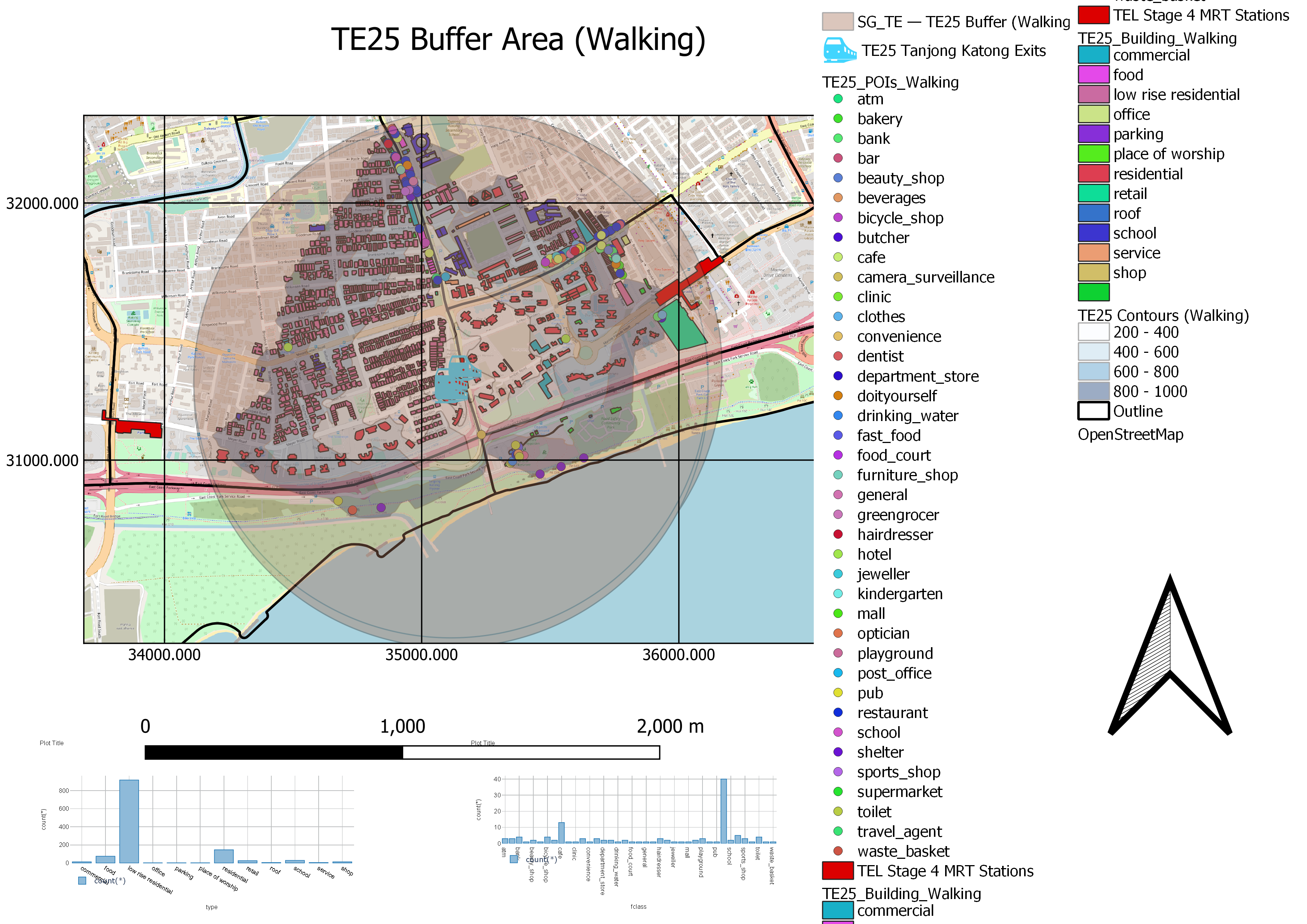 Similarly to TE24 Katong Park, the walking contour intervals for TE25 Tanjong Katong are also evenly distributed. This means that the walking catchment area is more well-connected by the roads within the area.The Singapore Government can explore improving the road network systems to expand the walking catchment area upwards towards the buffer limit. However, since the walking catchment area covers a significant part of the buffer, it shows that the existing road network is almost at optimum and location is ideal for Singaporeans for Singaporeans to walk to TE25 Tanjong Katong with ease.