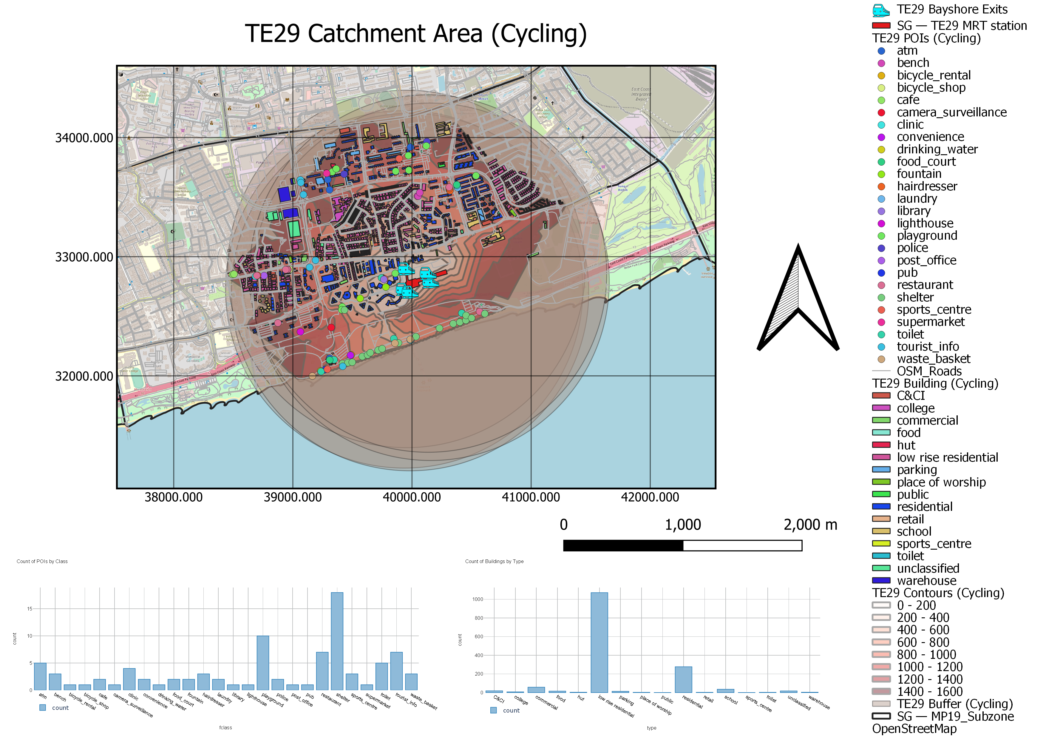 Similarly to TE28 Siglap, the cycling contour intervals for TE29 Bayshore are also relatively distributed. This means that the cycling catchment area is more well-connected by the roads within the area. Since the cycling catchment area covers a significant part of the buffer, it shows that the existing road network is almost at optimum and location is ideal for Singaporeans to cycle to TE29 Bayshore with ease.