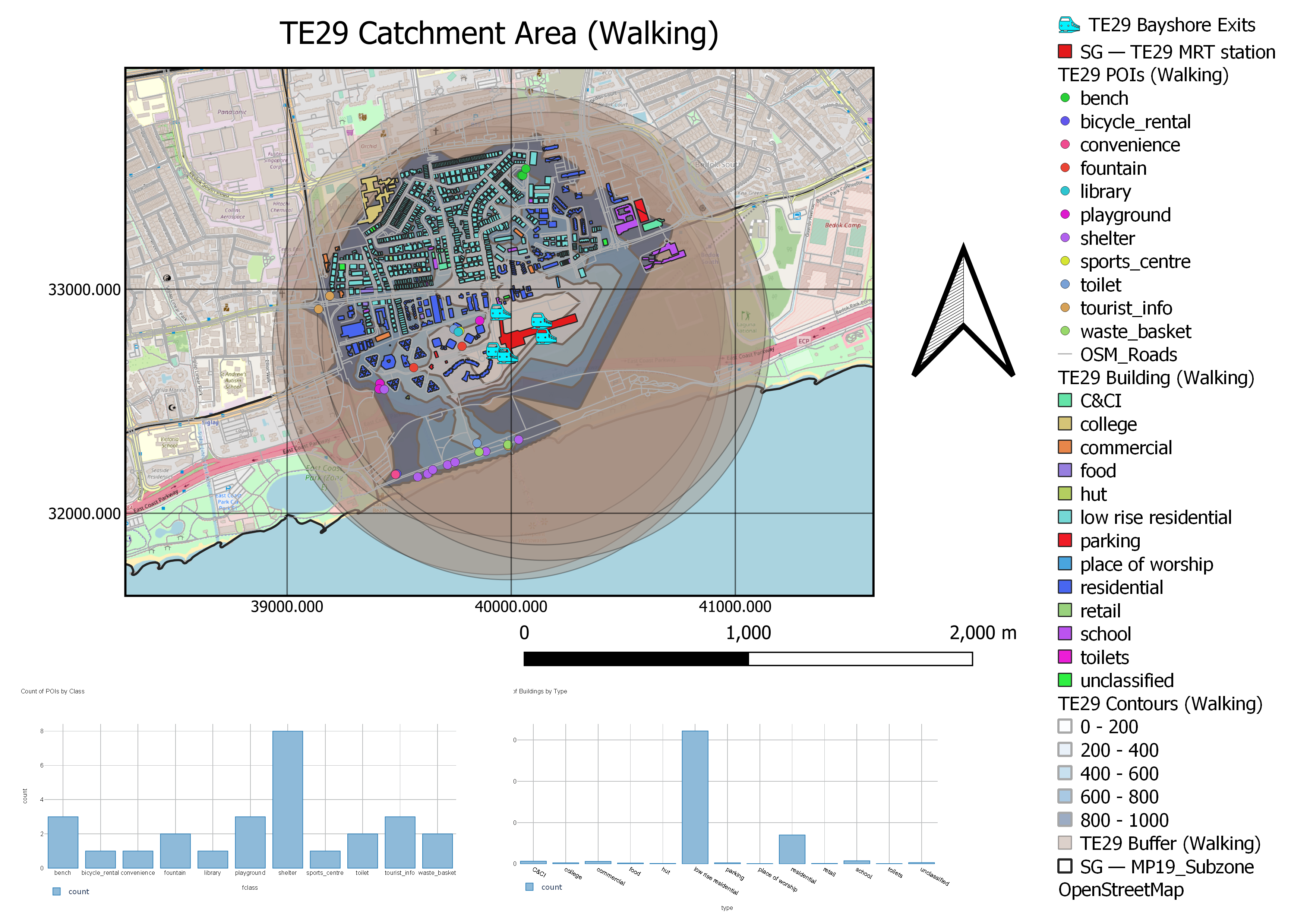 Given that this catchment area is quite small, TE29 Bayshore still has 5 MRT exits, two of which do not have any buildings or POIs near them. This may suggest that these 2 exits in the East of TE29 Bayshore MRT are redundant since any other POIs or buildings are closer to the 3 other exits that TE29 Bayshore already has. Building unnecessary exits may cause users alighting at TE29 Bayshore to get confused by which exit to come out from, causing accidental mistakes and prolonging the last mile journey. Hence, this may make the last mile journey for people alighting at TE29 Bayshore more difficult and unpleasant.