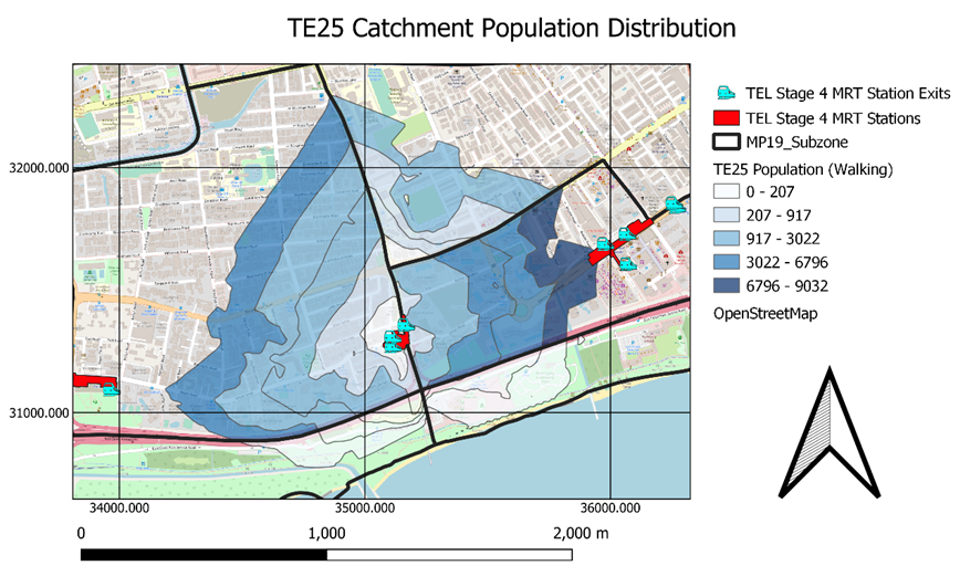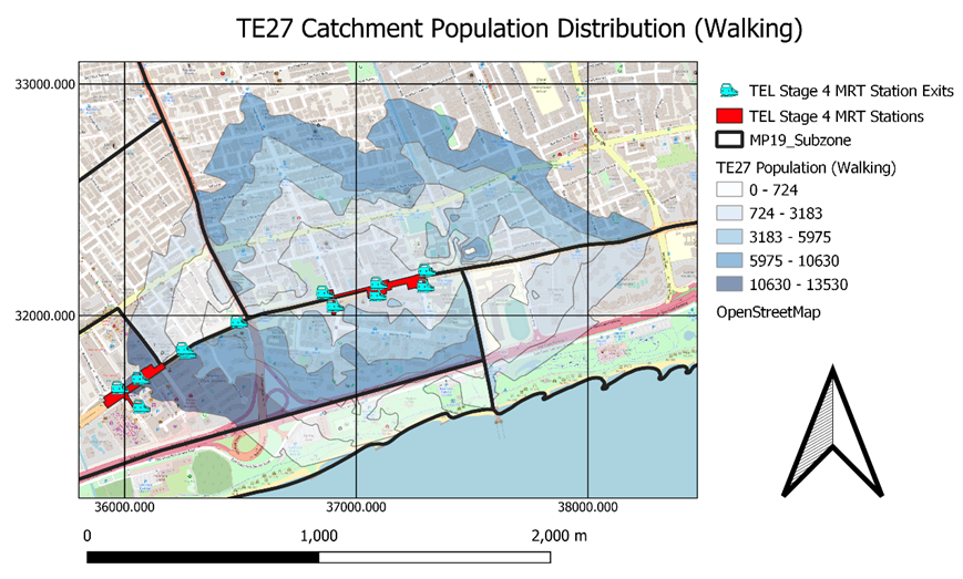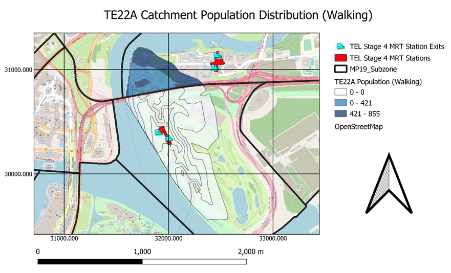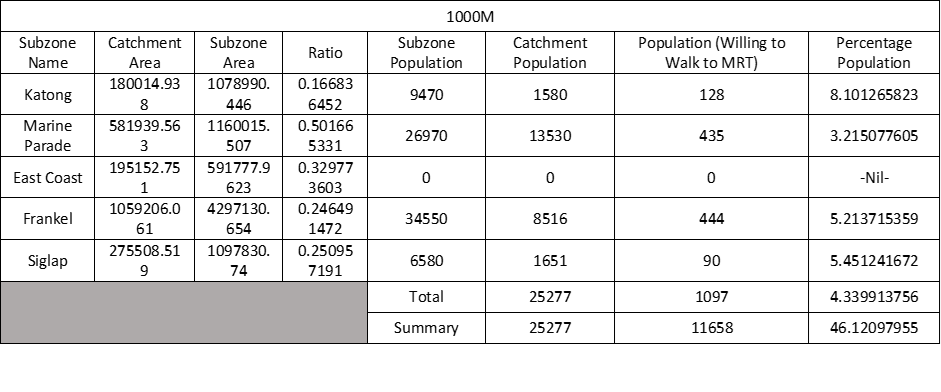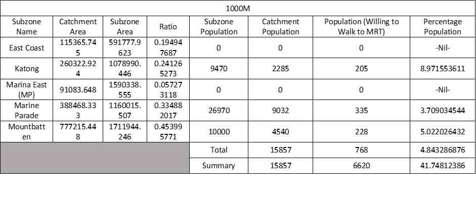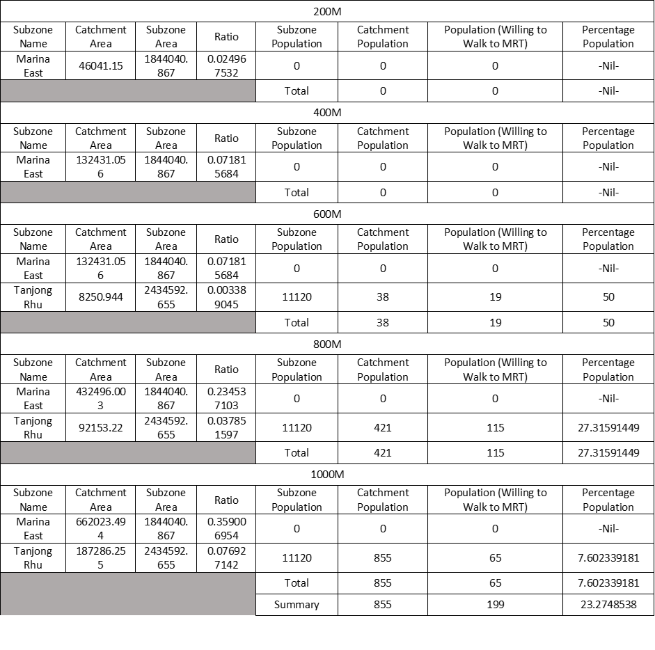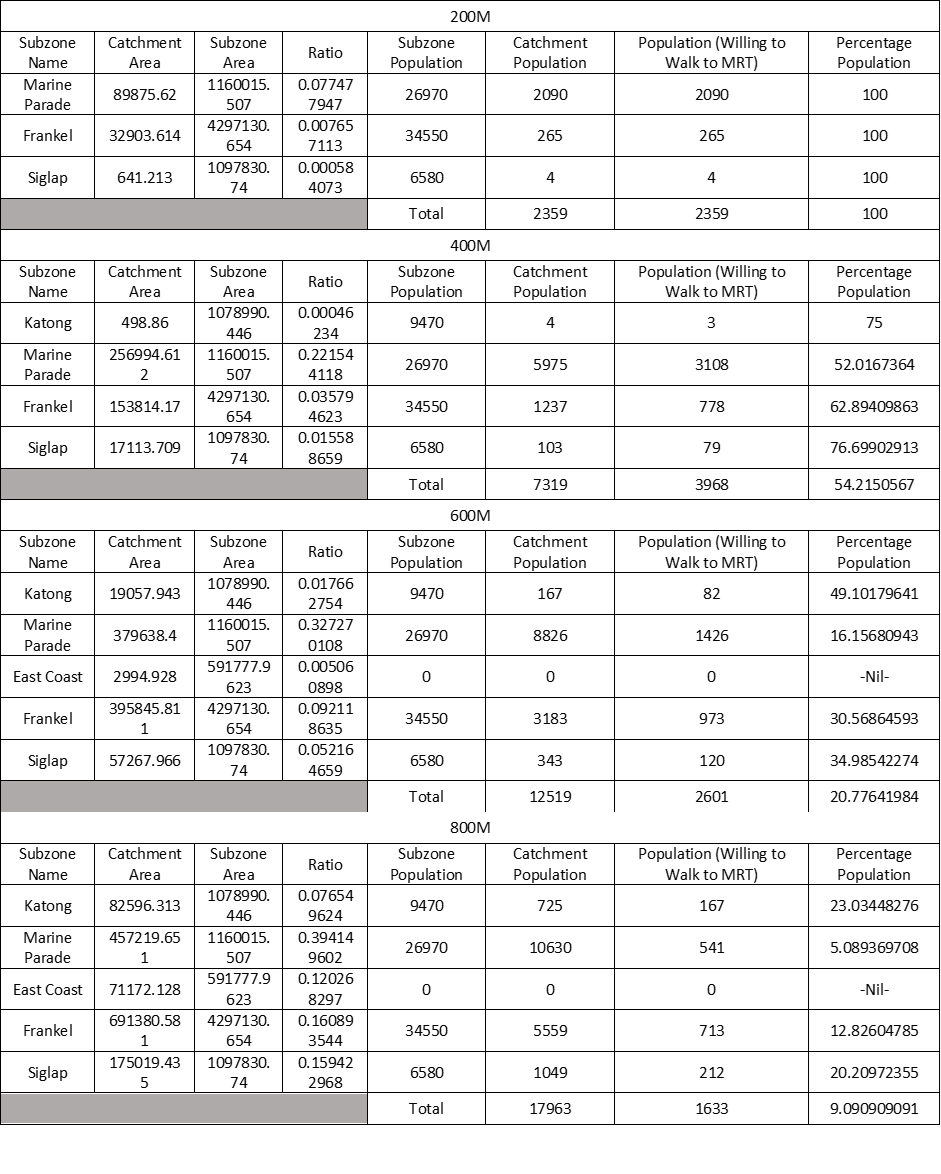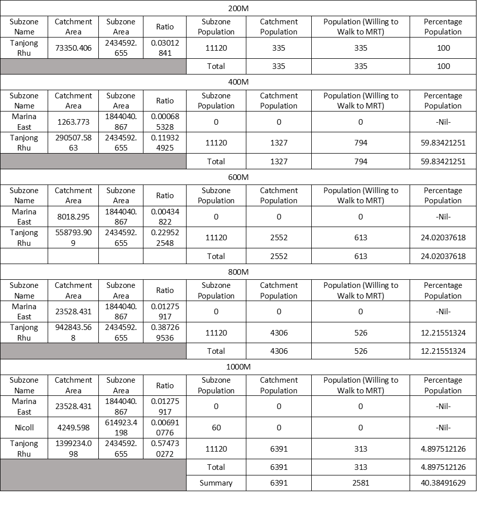 | Population (Willing to Walk to MRT) | Calculated Catchment Population who is willing to walk to MRT | 200m: Catchment Population (0-200m) * 1 400m: Catchment Population (200-400m) * 0.8 600m: Catchment Population (400-600m) * 0.5 800m: Catchment Population (600-800m) * 0.3 1000m: Catchment Population (800-1000m) * 0.15 |