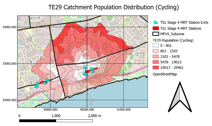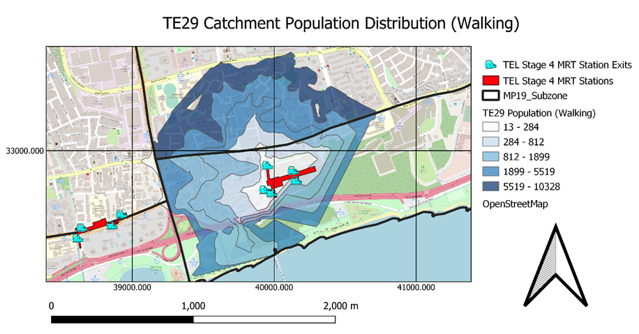 13004 Singaporeans stay within the 1000m contour but only 4289 of them are willing to walk to TE29 Bayshore. The percentage of catchment population who is willing to walk to MRT Station over catchment population is 33.0%. This percentage does not reflect the number of Singaporeans who is willing to take public transportation but reflects the number of Singaporeans willing to walk to MRT station.