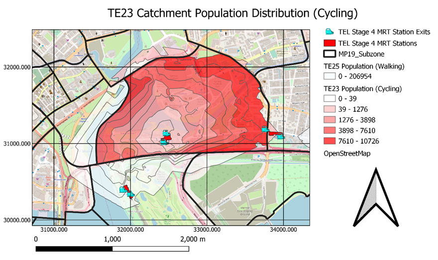 6391 Singaporeans stay within the 1000m contour but only 2581 of them are willing to walk to TE23 Tanjong Rhu. The percentage of catchment population who is willing to walk to MRT Station over catchment population is 40.4%. This percentage does not reflect the number of Singaporeans who is willing to take public transportation but reflects the number of Singaporeans willing to walk to MRT station.