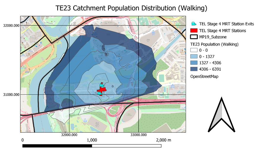 We further broke down the population distribution per contour and subzone level below to visualize these numbers more clearly. Additionally, we will be multiplying these numbers at every contour level by a ratio (as mentioned earlier) to accurately reflect how many people who are willing to walk to TE23 Tanjong Rhu (shown below).