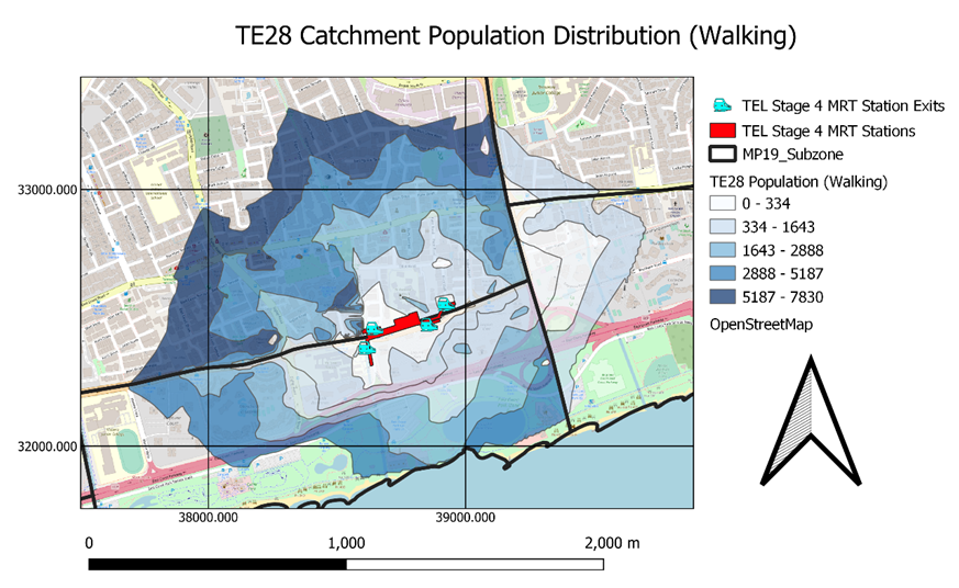 13544 Singaporeans stay within the 1000m contour but only 4982 of them are willing to walk to TE28 Siglap. The percentage of catchment population who is willing to walk to MRT Station over catchment population is 36.8%. This percentage does not reflect the number of Singaporeans who is willing to take public transportation but reflects the number of Singaporeans willing to walk to MRT station.