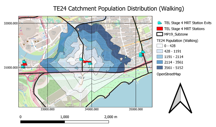 Based on the Walking Catchment Population Distribution for TE24 Katong Park, we can see that these following subzones (Aljunied, Marina East (MP), Mountbattenl and Tanjong Rhu) are captured at the 1000m mark. However, we can see that the largest proportion of catchment population falls within Mountbatten. This is shown by the darkest blue contour layer.